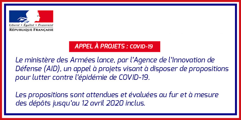 Cet appel à projets du ministère des Armées, lancé par l’Agence de l’Innovation de Défense (AID), dans le cadre du plan gouvernemental de lutte contre le COVID-19, vise à disposer de propositions pour lutter contre la pandémie de COVID-19. Il porte sur la recherche de solutions innovantes, qu'elles soient d’ordre technologique, organisationnel, managérial ou d’adaptation de processus industriels, qui pourraient être directement mobilisables afin de : protéger la population, soutenir la prise en charge des malades, tester la population, surveiller l’évolution de la maladie au niveau individuel et l’évolution de la pandémie, ou aider à limiter les contraintes pendant la période de crise.