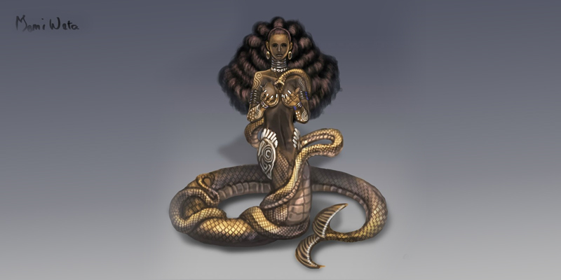 Parfois décrite comme une sirène, mi femme mi poisson, ou d’une belle femme tenant un serpent(qu’on trouve dans les régions côtières de l’ouest de l’Afrique et en Afrique centrale), la divinité Mami Wata représente l'esprit de l’eau. Dans la diaspora, elle est connue sous le nom de Watramama au Suriname et en Guyane; Mamadjo à Grenade; Yemanya / Yemaya au Brésil et à Cuba; La Sirène, Erzulie et Simbi en Haïti; ou encore Manman dlo dans les Antilles françaises.