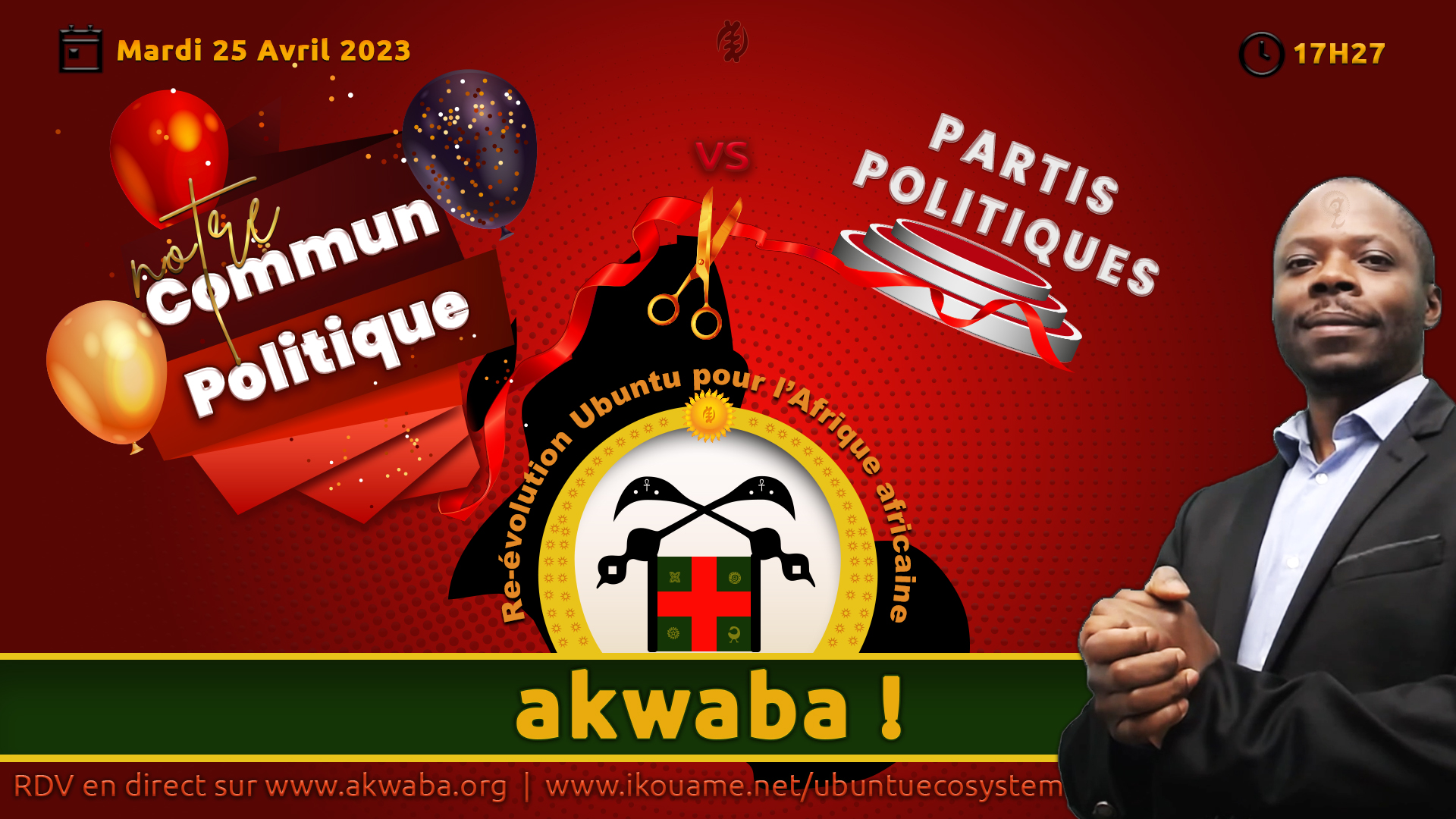 Après la publication la semaine dernière du site web de notre commun politique Akwaba ! Re-évolution Ubuntu pour l’Afrique africaine (https://www.akwaba.org), je vous donne RDV ce mardi 25 avril 2023 à 17H27, dans le cadre d’un discours public que j’aurai plaisir à vous livrer sur le thème suivant : “Akwaba : Notre commun politique VS le système des partis politiques”.